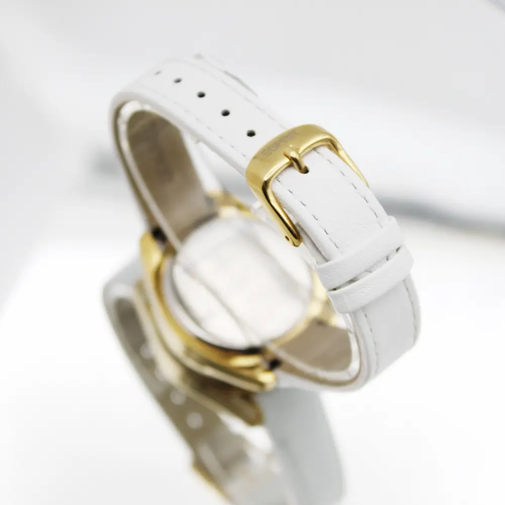 • بند چرم سفید رنگی تمیز، لطیف و کاملاً هماهنگ با طراحی کلی ساعت دارد.