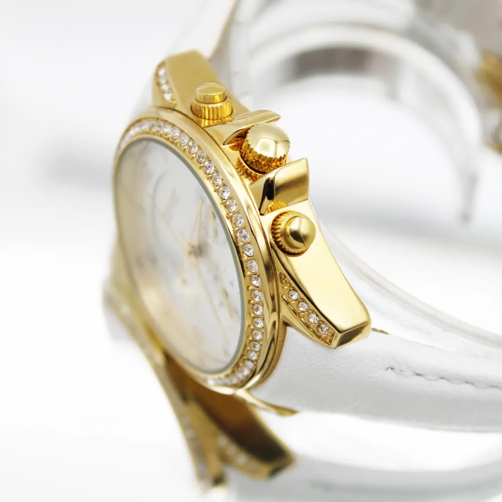 • قاب ساعت با نگین‌های ریز و درخشان تزیین شده که در هر زاویه نور می‌درخشند و جلوه‌ای لاکچری به ساعت می‌بخشند.