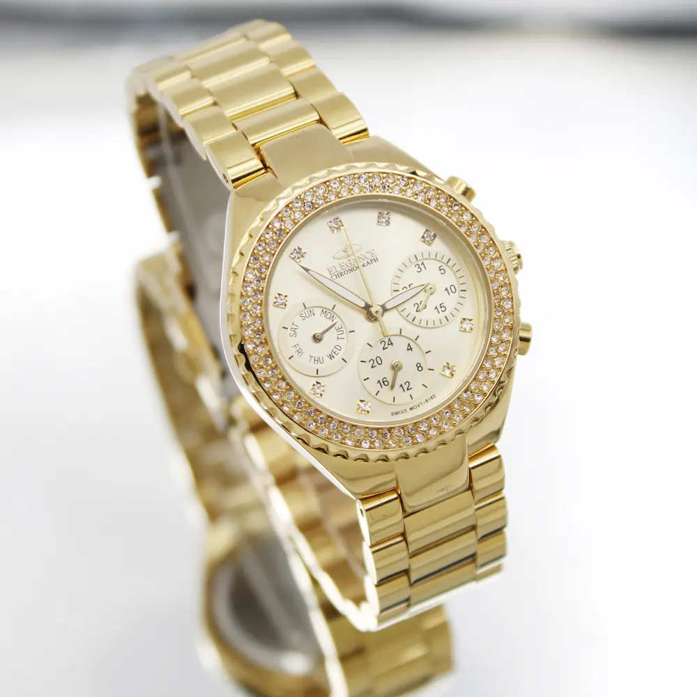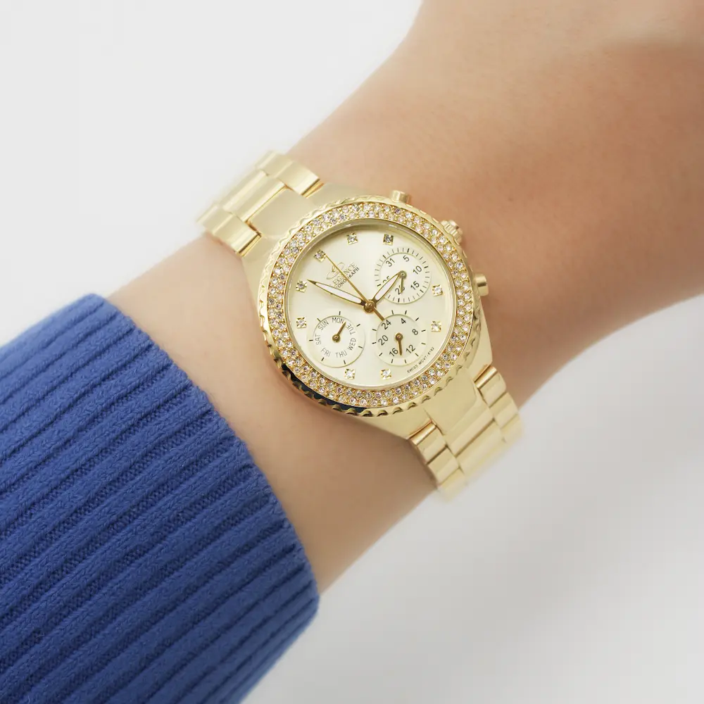 بدنه طلایی، صفحه سفید و قاب نگین‌کاری‌شده، ساعتی کاملاً زنانه و چشم‌گیر خلق کرده‌اند.