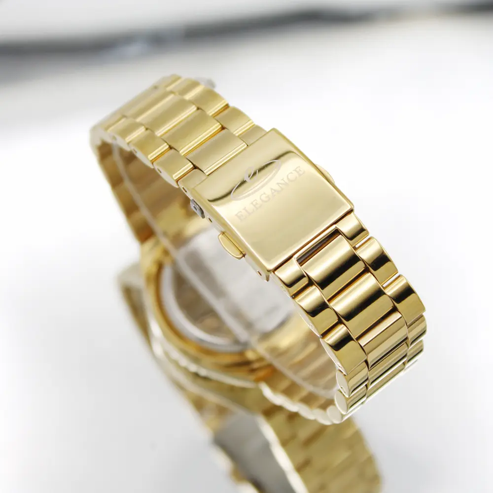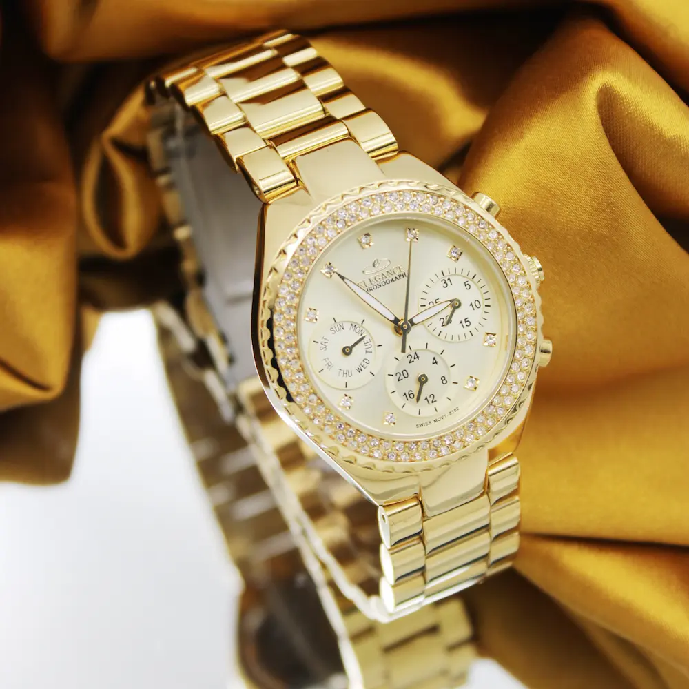 ساعت مچی زنانه الگانس مدل 88182 یک انتخاب لوکس، درخشان و کاملاً متفاوت برای خانم‌هایی است که به ظرافت، کیفیت و جزئیات دقیق اهمیت می‌دهند. این مدل با طراحی طلایی چشم‌گیر، موتورهای فعال واقعی و متریال ممتاز، به‌سرعت در لیست محبوب‌ترین ساعت‌های زنانه قرار گرفته است.