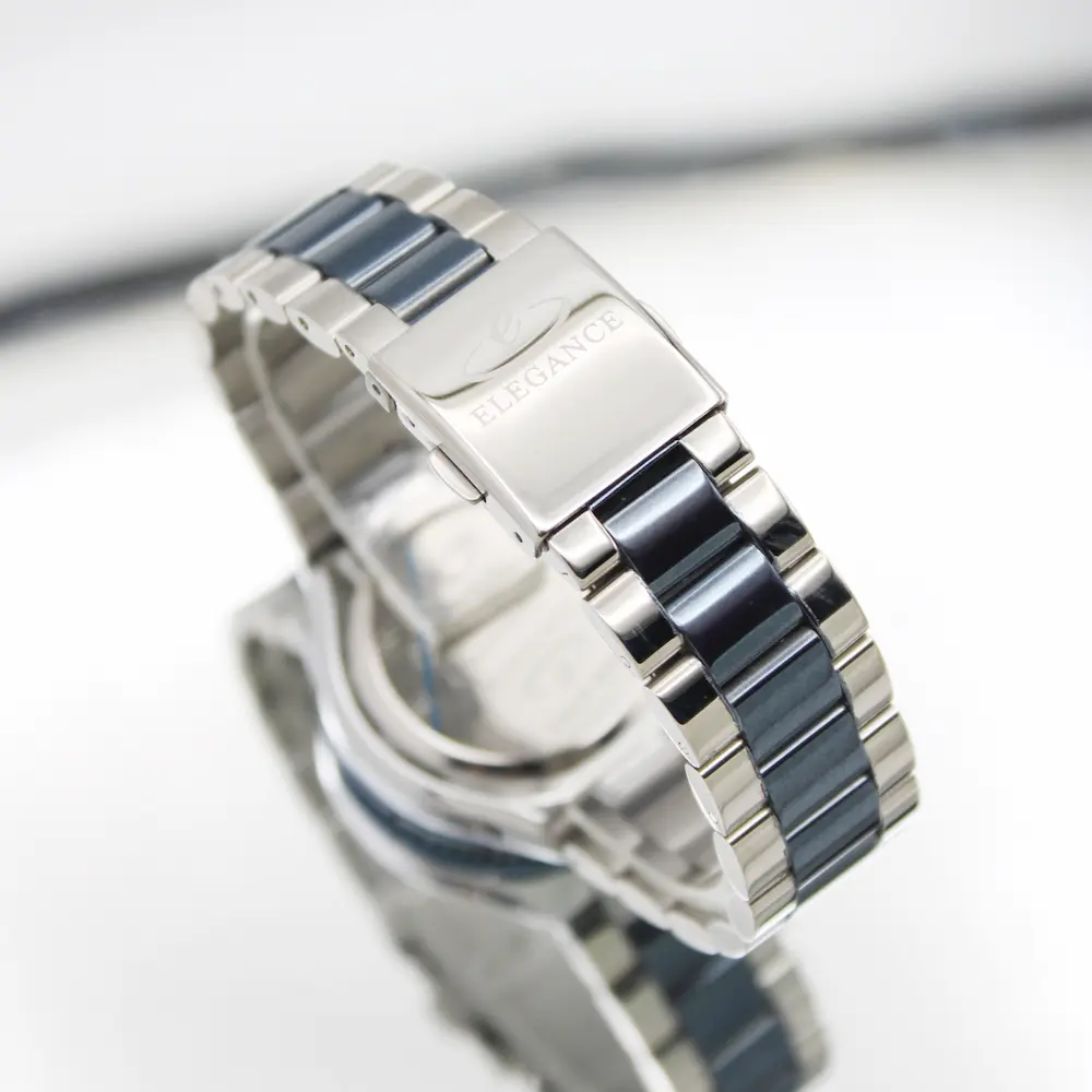 • بند استیل دو رنگ (نقره‌ای – آبی) با جلوه چشم‌گیر