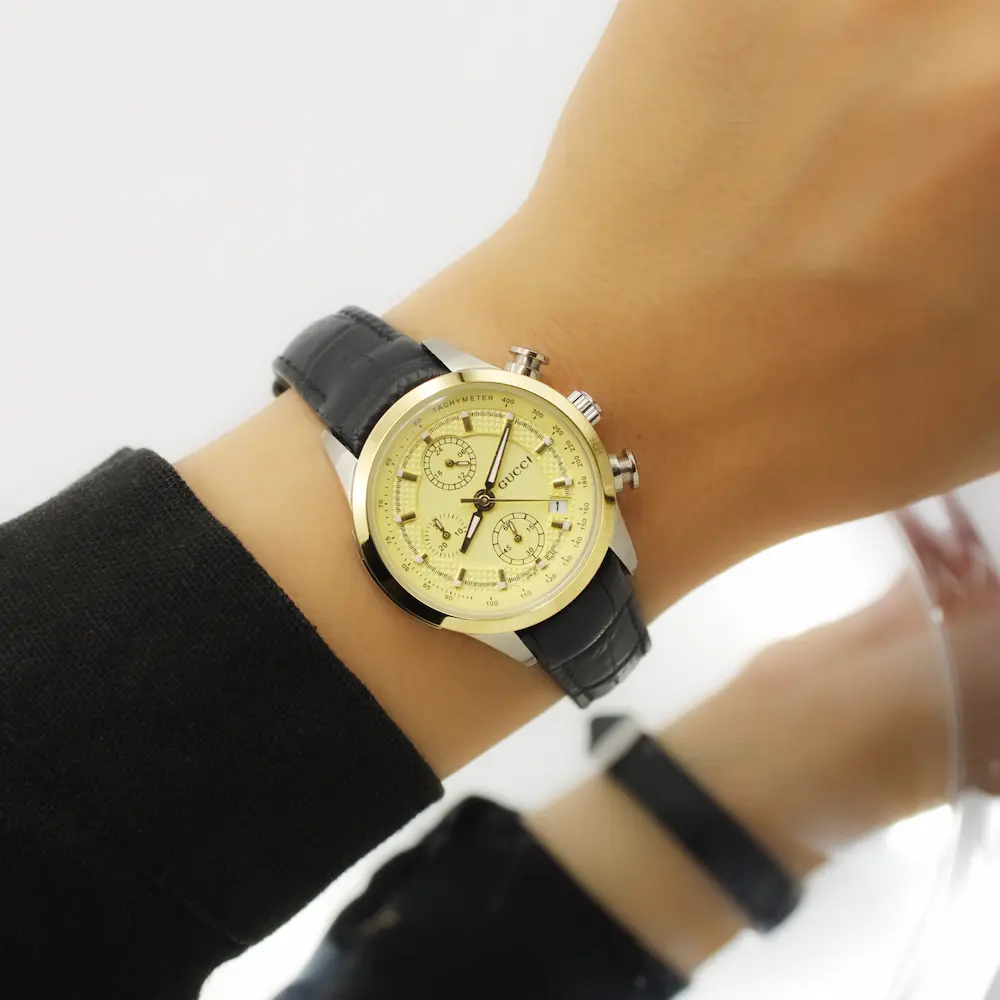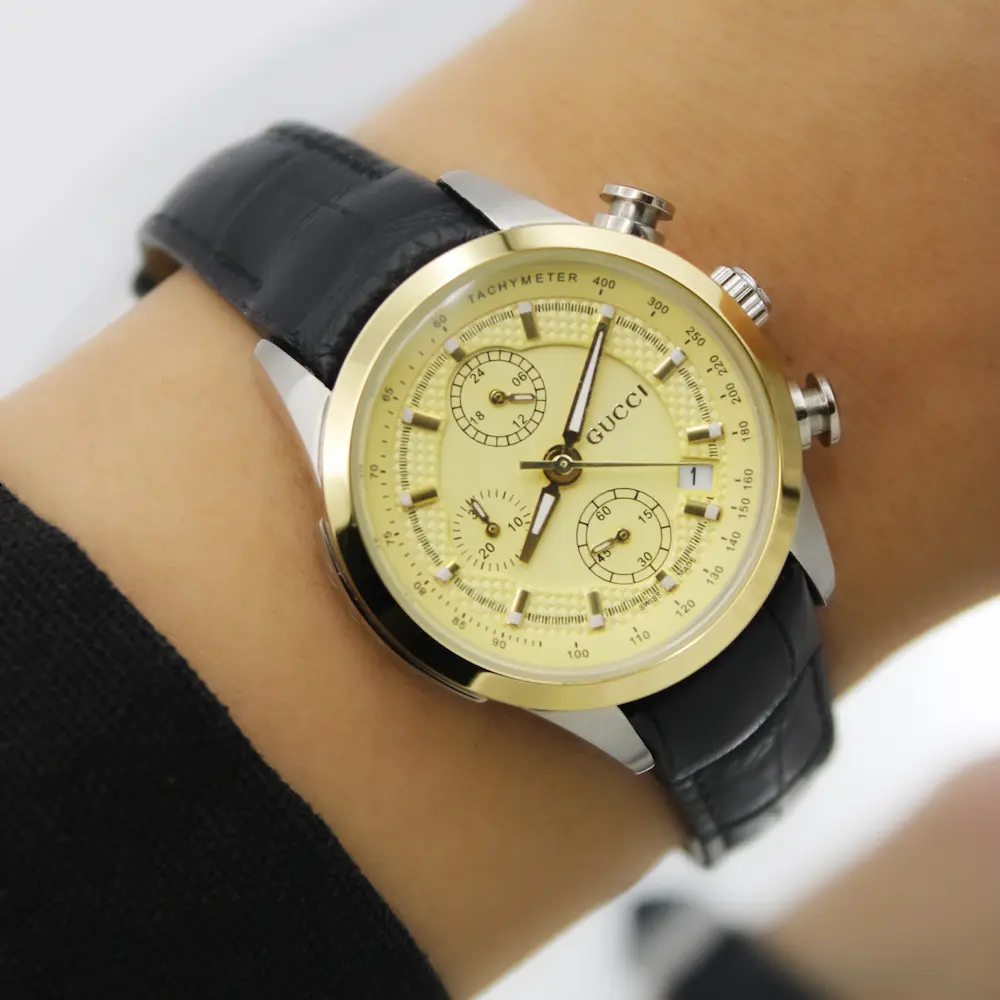 ساعت مچی عقربه ای زنانه گوچی مدل 8256 بی شک توی مدل ها و زیبایی در اولویت قرار داره.این ساعت مچی علاوه بر ظاهر و طراحی خاص و زیبا از کیفیت بی نظیری برخوردار است.موتور این ساعت با کیفیت ، ژاپن و 3 موتور فعال کرنوگراف می باشد.این ساعت مچی عقربه ای زنانه گوچی مدل 8256 مناسب برای خانم هایی می باشد که به تیپ و ظاهر اهمیت می دهند و وقت شناس هستند.موتورهای این ساعت به ترتیب 2 عقربه نمایشگر کرنو ، 1 عقربه نمایشگر ساعت 1 تا 24 می باشد.این ساعت دارای نمایشگر تقویم نیز میباشد.عقربه های این ساعت مچی عقربه ای زنانه گوچی مدل 8256 شبتاب می باشد و در تاریکی هم قابلیت خوانده شدن را دارد.طراحی خاص این ساعت و ترکیب رنگ های خاص پسند ، نمای این ساعت را بی حد و مرز کرده است.ترکیب رنگ های زرد ، طلایی و مشکی در صفحه این ساعت باعث شده نظر هر بیننده ای را خود جلب کند.تمایز رنگ موتورها و عقربه ها با رنگ زمینه در صفحه این ساعت در صفحه خواندن آن ها را بسیار آسان کرده.ترکیب رنگ ها خاص و شکیل صفحه با قاب و قفل نقره و طلایی ، بند مشکی زیبایی بی نظیری به ظاهر این ساعت بخشیده است.این ساعت مچی عقربه ای زنانه گوچی مدل 8256 مچی دارای 1 سال گارانتی کارکرد موتور و باتری می باشد.جنس بدنه استیل درجه 1 آنتی آلرژی و جنس بند این ساعت چرمی می باشد.این ساعت مچی عقربه ای زنانه گوچی مدل 8256 بی تردید جز زیباترین و باکیفیت ساعت های مدرن می باشد.مجموعه شمسین این ساعت زیبا و باکیفیت را همراه با پک بسته بندی ساعت و 1 سال گارانتی کارکردموتور و باتری خدمت شما عزیزان ارائه می دهد.شما می توانید اکسسوری مدنظرتان را بصورت نقد ویا اقساط از مجموعه شمسین تهیه کنید.