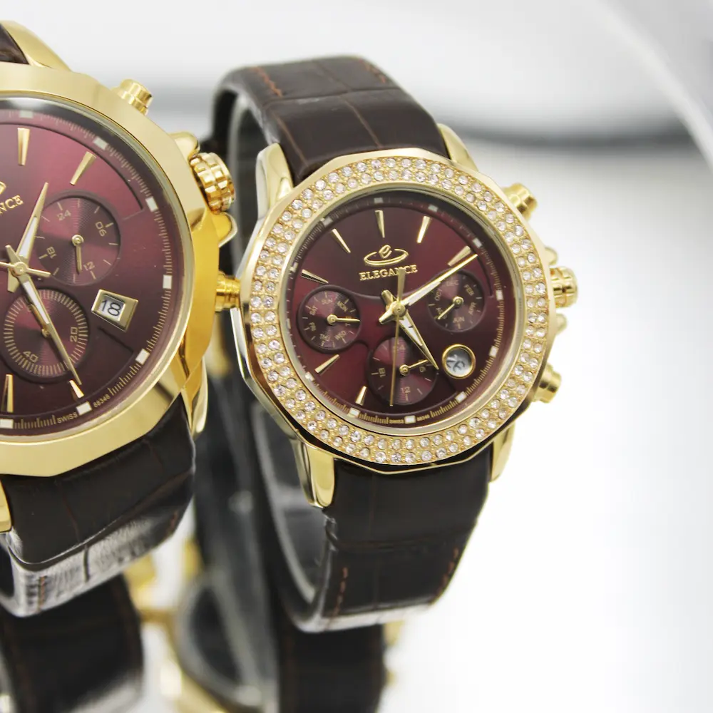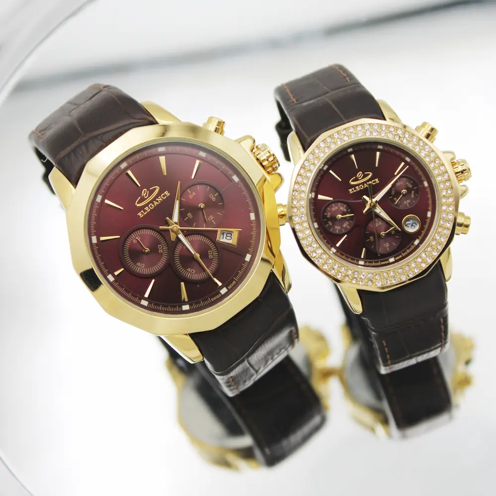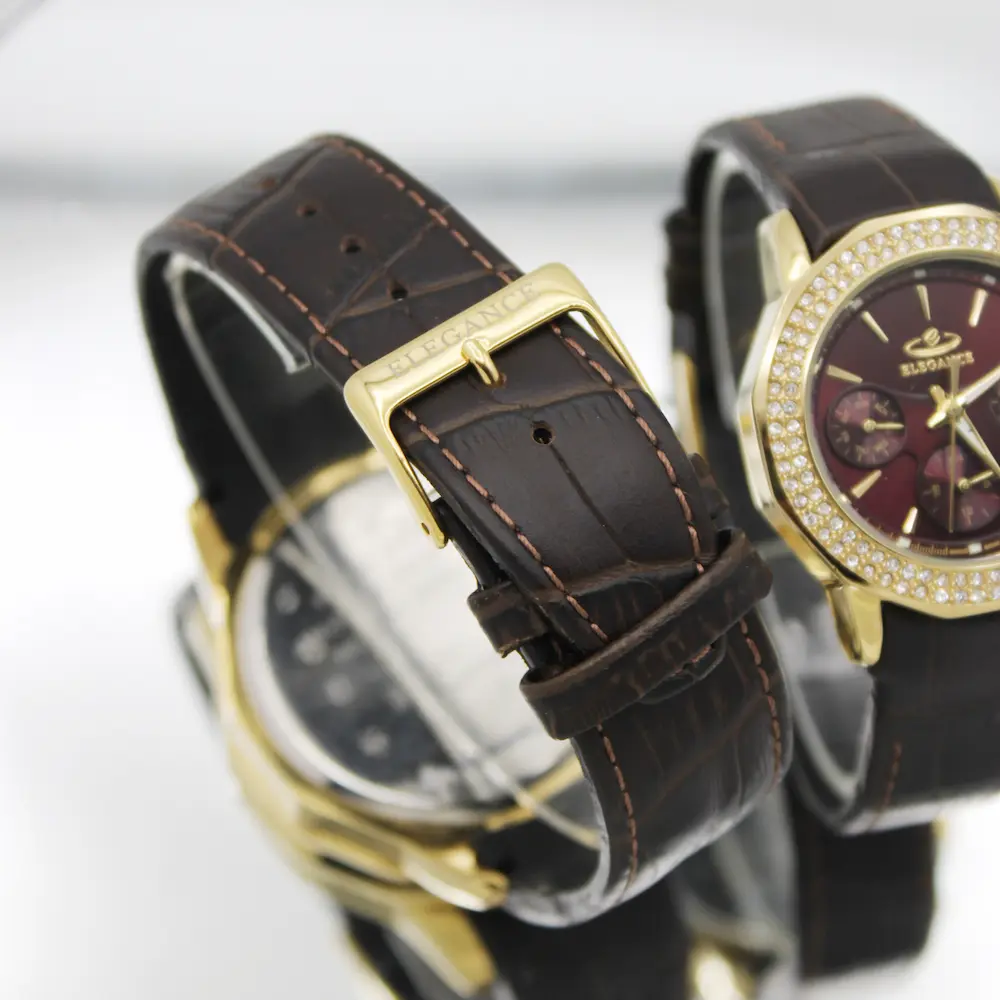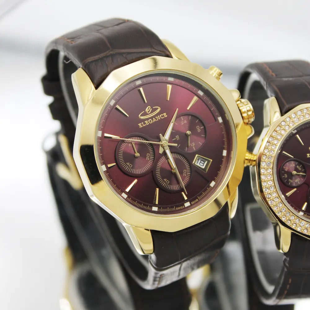 این ست با صفحهی زرشکی براق و قاب طلایی، جلوهای خاص و چشمگیر دارد. در نسخه زنانه، قاب با نگینهای ریز و درخشان تزئین شده و ظاهری شیک و لوکس ایجاد کرده است. نسخه مردانه طراحی سادهتر اما کاملاً هماهنگ با مدل زنانه دارد. هر دو ساعت دارای عقربهها و اندکسهای شبتاب هستند که در تاریکی خوانایی بالایی دارند.