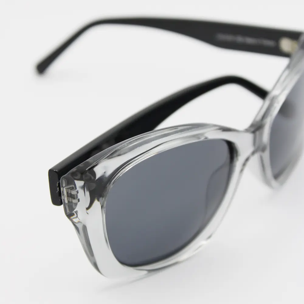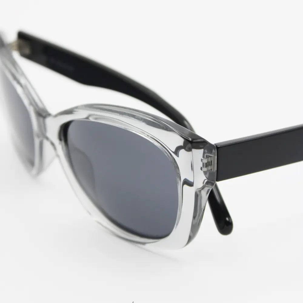 فریم شفاف-سیلور در بخش جلو، زیبایی مدرن و متفاوتی ایجاد کرده که با دستههای مشکی ساده ترکیب شده.